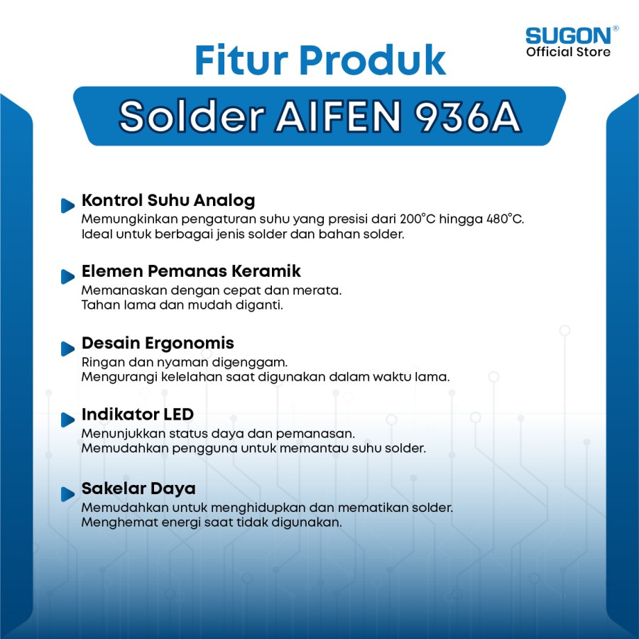 Memberikan pemanasan yang kuat dan stabil. Cocok untuk berbagai aplikasi solder.